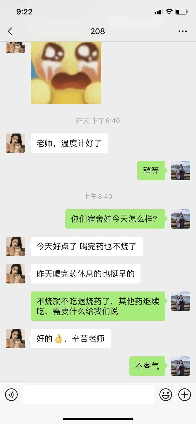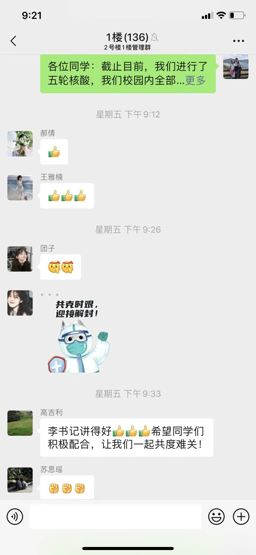 在公司启动预案、进行动员的第一时间,公司领导、老师积极参与投入楼长、层长工作,入驻宿舍与同学们朝夕相处,一同克服各类困难:半夜敲门提醒全体同学起床,科学组织全员核酸;在微信群里给员工分析形势、解释政策,排解压力;将公司为大家发的爱心水果挨个送到宿舍,及时上门补充口罩;联系医务室处理员工感冒发烧,外出将住院员工接回。几日的相处,师生们彼此信赖、相互支持。