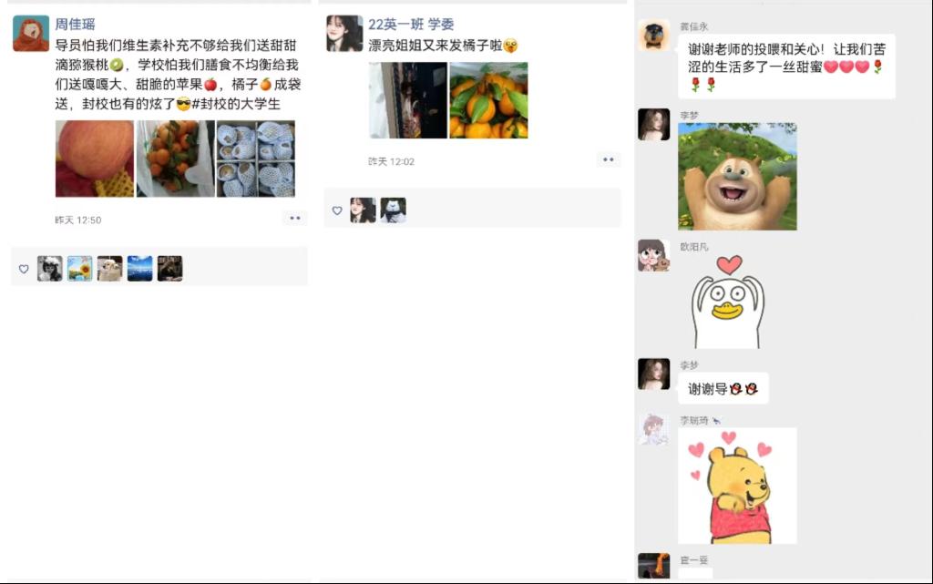 “橘子成袋送,封校也有的炫了”,“漂亮小姐姐又来发苹果了”,“感谢老师的投喂和关心,让我们苦涩的生活多了一丝甜蜜”,“导员怕我们维生素补充不够给我们送甜甜滴猕猴桃”......这是近期同学们发的朋友圈,疫情无情,辅导员和班主任有情,虽然无法在第一线陪伴大家,但却想方设法让同学们在枯燥的居家生活中,感受到温暖和关怀。突发的疫情,对于今年考研的员工来说无疑是一场意料之外的考验,疫情打乱了他们的学习计划和学习方式,宿舍环境无法达到全身心投入,没有高效的学习,这使得很多同学特别焦虑烦躁。因此,他们的辅导员每天都会在网上与同学们沟通交流,疏导情绪,加油打气、排忧解难,时不时再给大家送点小零食,让他们感受到自己不是孤军奋战,还有老师、朋友和家人是他们坚强的后盾。
