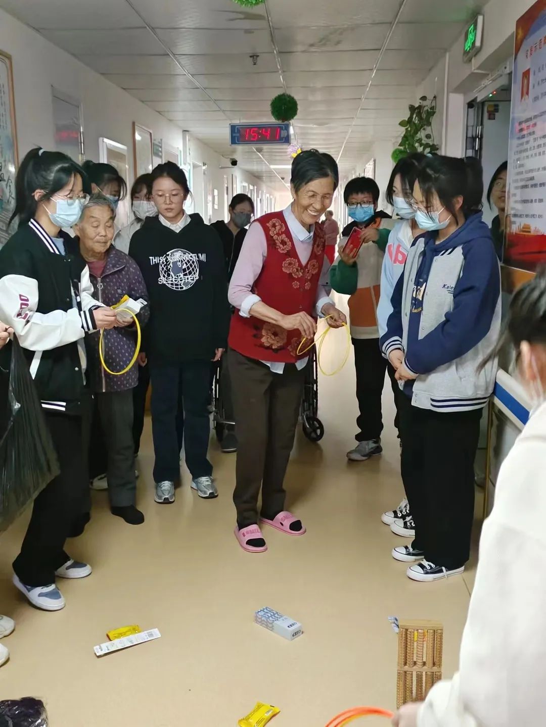 进入养老院后,由黄丽娟和王凤英带领员工们将带来的慰问小礼品,如剪纸、袜子、牙膏牙刷、香皂等抬上8楼。进入楼层后有序组织员工分组进入房间陪老人聊天,开展一系列小活动如剪纸、手指操、套圈活动,并为过生日的老人送上祝福。整个活动过程坚持陪伴为主,游戏为辅,将老人的安全放在首位。
