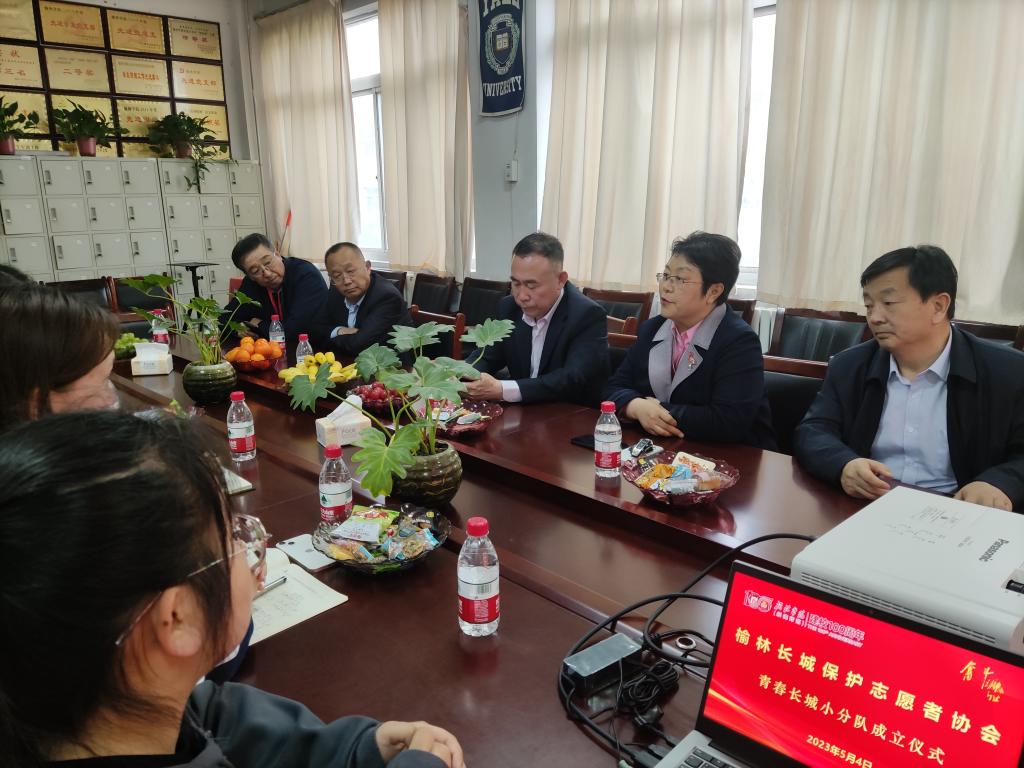 会议第二项,榆林市长城保护志愿者协会会长高秋燕给大家介绍了协会的成立和目前的发展情况,并亲切的给大家分享了她在长城志愿服务中的成长经历和工作过程中遇到的感人事迹,让在场的师生都备受鼓舞。