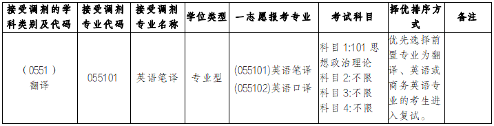 3. 调剂考生第一志愿专业与调入专业相同相近,或初试科目与调入专业初试科目相同相近。其中一志愿报考专业的统考科目数量≥公司英语笔译专业的统考科目数量。