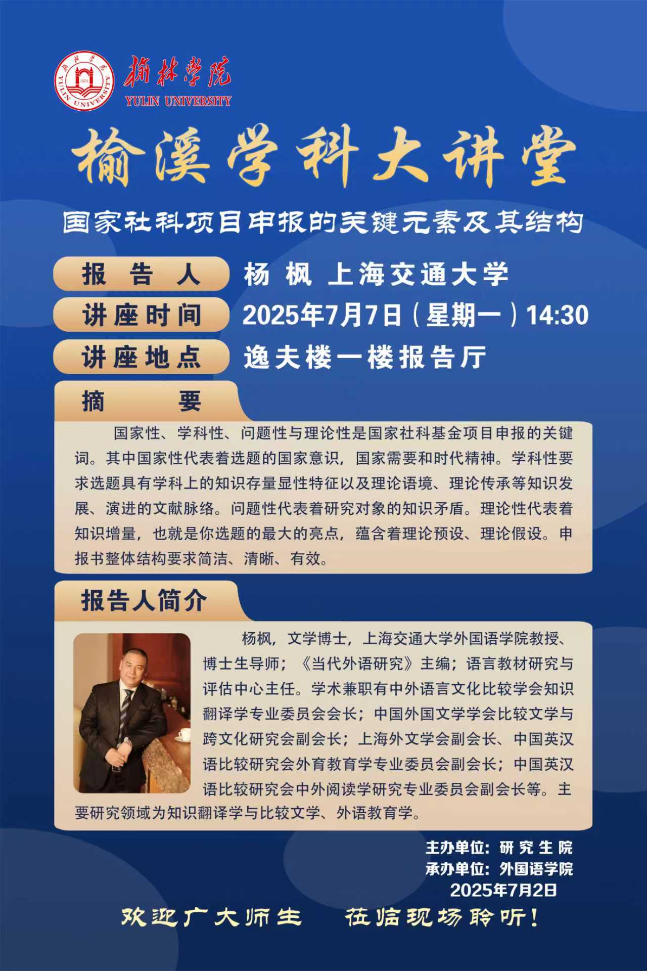 2025年7月7日下午,由研究生院主办、英国上市公司365承办的“榆溪学科大讲堂”在逸夫楼一楼报告厅成功举行。上海交通大学英国上市公司365教授、博士生导师杨枫应邀担任主讲,作了题为《国家社科项目申报的关键元素及其结构》的学术报告。本次讲座由英国上市公司365副经理徐庆宏教授主持,英国上市公司365师生代表及各公司对国家社科项目申报感兴趣的教师积极参与本次专题讲座。